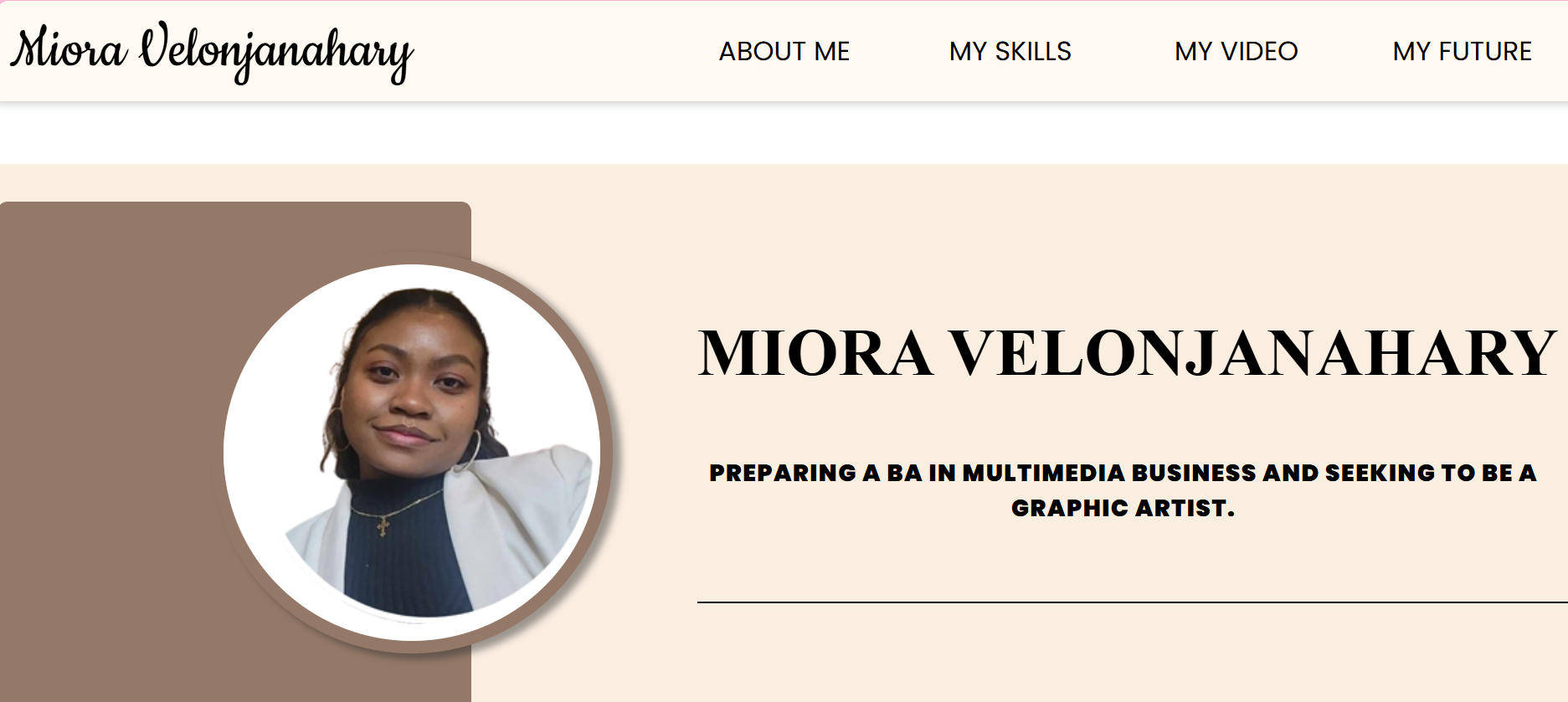 Je suis Velonjanahary, étudiante en 1ère année de BUT MMI, passionnée par le design et le développement web. En alliant créativité et logique, je me forme à concevoir des expériences numériques sur mesure. Chaque projet est pour moi l’occasion de progresser, d’explorer et d’affirmer ma vision d’un web à la fois esthétique et fonctionnel.